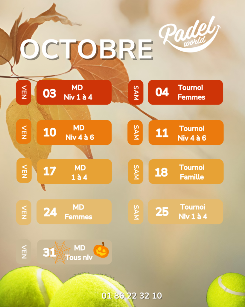 La programmation du mois d’octobre de votre salle padelworld de Maurepas est annoncée…. du fun, du fun pour ce mois d’automne